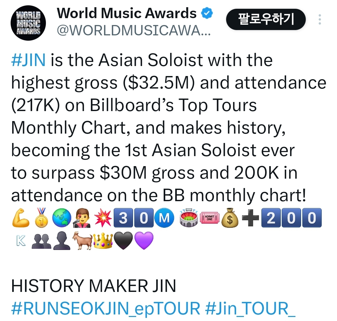 팝 전문 계정 Pop Core 또한 진이 빌보드 톱 투어 월간 차트에서 3,250만 달러의 매출과 21만 7천 명의 관객 수를 기록했다며 이는 아시아 솔로 아티스트 사상 최고의 기록이라고 전했다.
