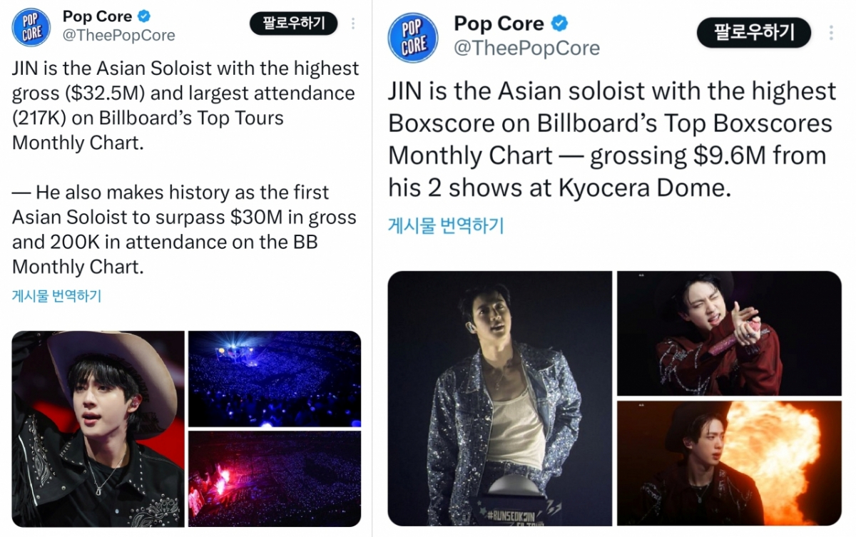 Pop Core는 또한 진이 빌보드 톱 박스 스코어 월간 차트에서 가장 높은 박스 스코어를 기록한 아시아 솔로이스트로, 교세라 돔에서 열린 2회 공연에서는 960만 달러의 수익을 올렸다고 밝혔다. 단 2회 공연으로 독보적인 수익을 올린 것.