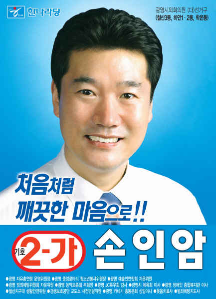 7일 의병전역을 앞둔 톱스타 원빈의 매형이자 소속사 드림이스트온의 대표인 손인암(43.사진)씨가 지난 5.31지방선거에서 경기도 광명시의원에 당선된 것으로 밝혀졌다.