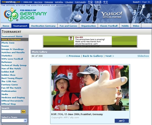 이번 사진은 한국과 토고 전이 열린 지난 13일 찍은 것으로 FIFA 월드컵 야후 공식 홈페이지의 포토 갤러리 카테고리에 올라와 있다.