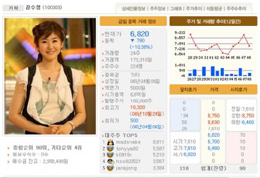 9일 스타의 인기도를 주가로 나타내는 사이버 스타증권 엔스닥에 따르면 강수정 아나운서는 주가 6820원을 기록해, 6910원을 기록한 박지윤 아나운서에게 선두자리를 빼앗겼다.