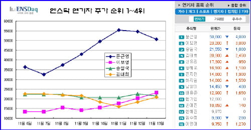 스타의 인기도를 주가로 나타내는 사이버 스타증권 엔스닥(www.ensdaq.com)에 상장된 이보영은 그동안 문근영 송일국 김태희 하지원 등에 밀려 상위권 진입에 어려움을 겪었다.