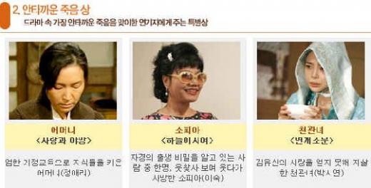이 상은 '안타까운죽음'상이라는 이름으로 SBS 연기대상 홈페이지에서 투표에 올랐으며, 드라마속 가장 안타까운 죽음을 맞이한 연기자에게 주는 특별상으로, '사랑과 야망'의 어머니(정애리), '하늘이시여'의 소피아(이숙), '연개소문'의 천관녀(박시연)가 후보에 올랐다.