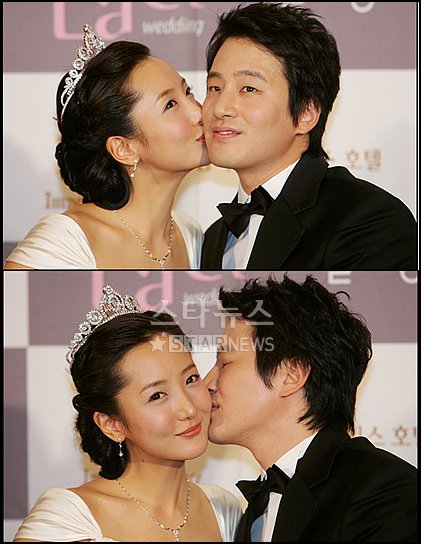 탤런트 사강이 27일 오후 2시 서울 임피리얼팰리스호텔에서 신세호씨와 화촉을 밝힌다. 결혼식에 앞서 가진 기자회견에서 사강-신세호 커플이 서로의 볼에 뽀뽀를 하고 있다.