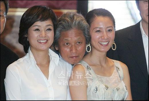 종방연에서 정을영PD가 배종옥과 김희애 사이에 얼굴을 넣고 포즈를 취하고 있다.