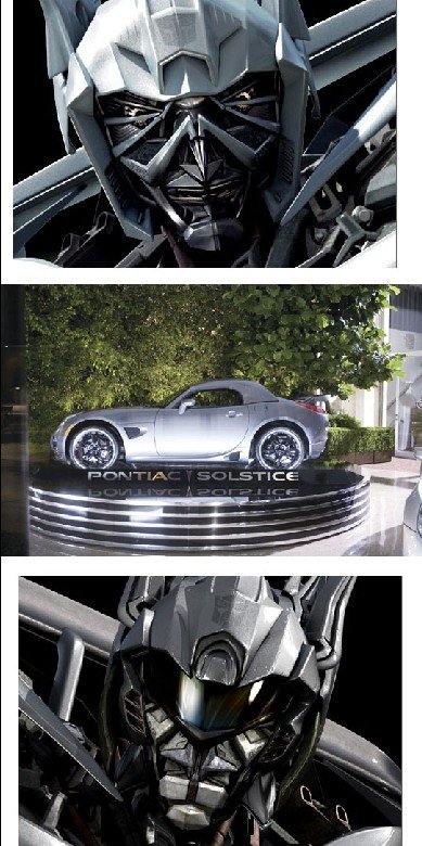 하지만 자동차가 주인공인 영화로는 지난달 28일 개봉한 마이클 베이 감독의 로봇 판타지 블록버스터 '트랜스포머'가 지존이다. 주인공 로봇이라 할 옵티머스 프라임의 변신차량(피터빌트 379모델)과 범블비의 변신차량(시보레 카마로)만 제외하고는 GM 차량으로 도배했다. 재즈 로봇은 GM의 폰티악 솔스티스 2인승 하드탑 모델(사진), 아이언하이드 로봇은 GM의 중소형 화물차인 톱킥 C4500 모델, 라쳇은 GM의 허머 H2 변형모델로 변신했다.