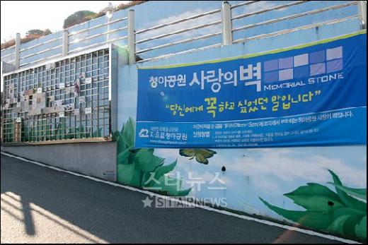 청아공원에 마련된 사랑의 벽에 개그맨 故양종철, 故윤혜영, 故김형은과 함께 사진속 환하게 웃고 있는 故김형곤이 자리해 있다.