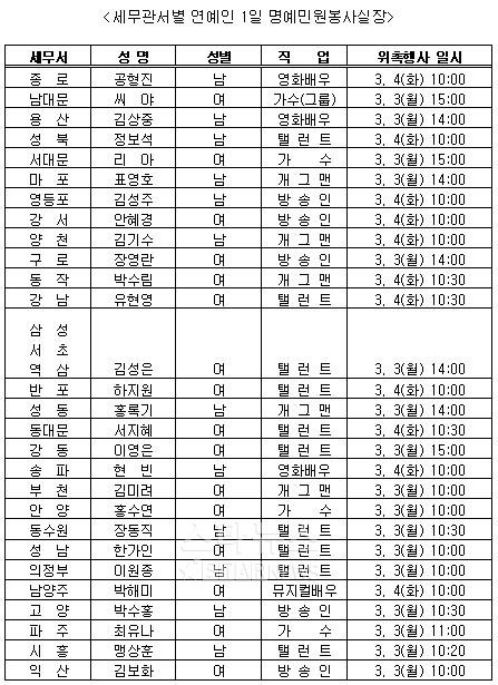 이들 연예인들은 '3월 3일 납세자의 날(42회)'을 맞아 일선 세무서에서 일일 민원봉사실장으로 활동하면서 세정현장을 직접 체험하는 기회를 갖게 된다.