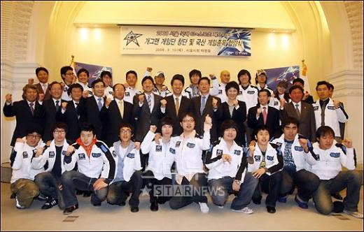 오세훈 서울시장등 참석자들이 개그맨 게임단과 함께 기념촬영을 하고 있다.