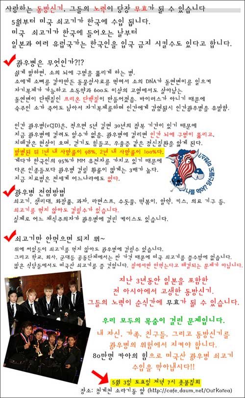 지난 2일 오전 이 UCC를 '동네방네'에 올린 아이디 '은하수'는 "미국산쇠고기 때문에 동방신기의 삶이 위험해지고, 지금까지 해왔던 해외활동도 어려워질 수 있다"며 동반신기 팬들의 '광우병 반대운동' 참여를 촉구했다.