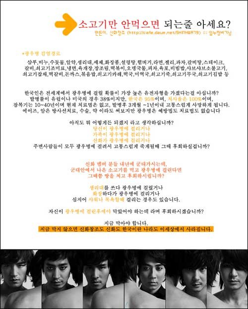 이중 신화-창조신화의 UCC에서는 "신화 멤버 분들이 내년에 군대 가시는데, 군대안에서 나온 쇠고기를 먹고 광우병에 걸린다면 그때쯤 땅을 치고 후회하시렵니까"라는 문구가 눈길을 끌었다.