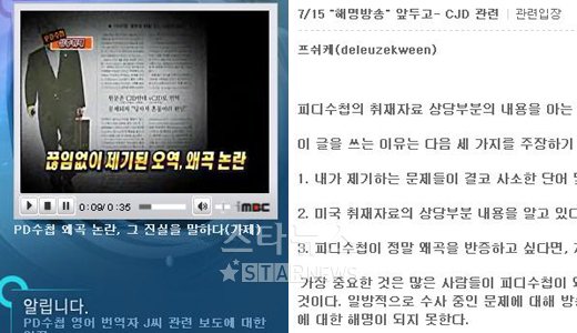 정씨는 15일 이같은 주장을 담은 글을 자신의 인터넷 카페를 통해 공개하며 'PD수첩'과 상당기간 공방을 벌여온 CJD(크로이츠펠트야코프병)와 vCJD(인간광우병) 쟁점을 중심으로 주장을 펼쳤다.