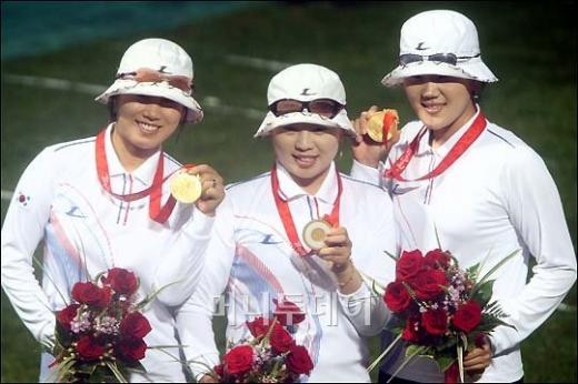 ↑ 여자양궁 단체전에서 금메달을 딴 주현정, 윤옥희, 박성현(왼쪽부터) ⓒ베이징(중국)=임성균 기자