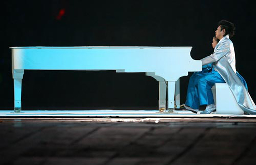 지난 8일 열린 개막식에서 세계적 피아니스트 랑랑(郞朗)과 5살 소녀가 함께 펼쳤던 피아노 연주가 가짜라는 주장이 나왔다. 그랜드 피아노의 덮개가 열려 있지 않았기 때문.
