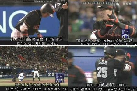 일본 중계진의 이승엽에 대한 찬사는 계속됐다. 캐스터는 "(이승엽은) 지난 시즌 무릎이 아픈 가운데 줄곧 시즌 마지막까지 경기에 계속 출장하는 등 '팀을 위해서'(for the team)라는 생각이 상당히 강하다"고 극찬했다. 그러자 호시노 감독도 "(그런 의식이) 강하다. 한국 선수들이 특히 그런 '팀을 위해서'라는 생각이 많다"고 덧붙였다.