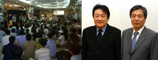 ↑KBS 사원행동(왼쪽)과 김성묵·류광호 신임 KBS 부사장