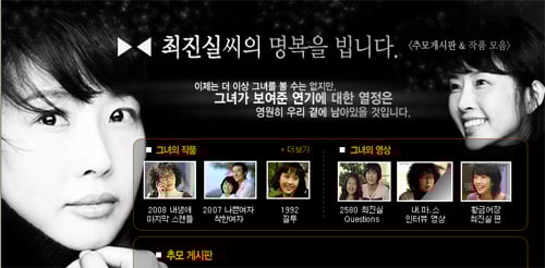 이후 웹페이지를 찾은 드라마 팬 등은 3일 오후 6시 30분 현재까지 162 건의 글을 남기며 갑작스레 곁을 떠난 고 최진실에 대한 안타까운 마음을 전하는 한편 떠난 그녀의 명복을 빌었다.
