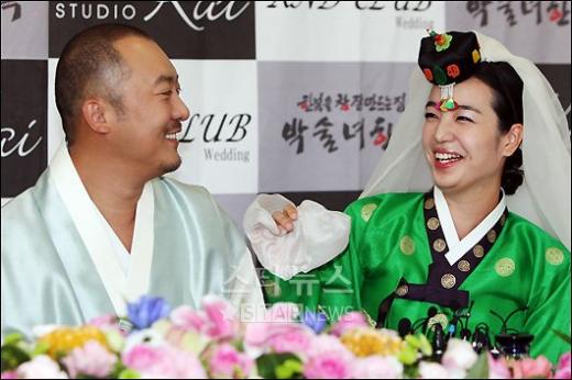 5일 오후 결혼식 직전 기자회견을 갖고 있는 염경환-서현정 커플 ⓒ송희진 기자