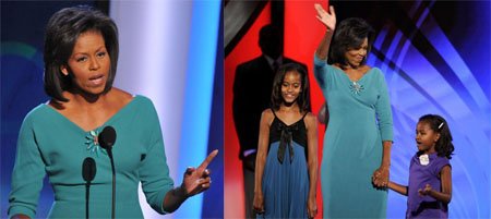 마리아의 옷 중 미셸이 유세 현장에서 입고 나와 가장 히트를 친 옷은 민주당 전당대회에 입고 나왔던 청록색 시스 드레스. 목 부위가 넓게 파이고 몸매가 강조된 이 드레스는 가슴 부분의 큰 브로치 외에 아무 장식도 하지 않아, 깔끔하고 우아한 실루엣을 뽐냈다.