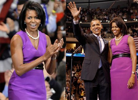 마리아가 디자인한 밝은 보라색 민소매 원피스도 미셸이 오바마가 지난달 미네소타주 세인트폴 유세에서 선보여 인기를 끌었다. 굵은 알의 진주 목걸이에 검은 벨트로 포인트를 준 미셸은 또 한번 패션으로 전 국민을 압도했다.