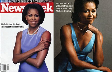 미셸은 뉴스위크 표지에 등장할 때도 마리아의 옷을 입고 나왔다. 미셸은 이 표지에서도 사각형의 네크라인이 파여진 연보라색 민소매 원피스를 택했다.