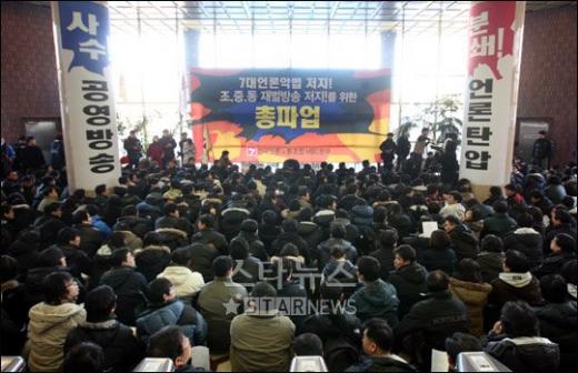 전국언론노동조합 MBC본부 조합(이하 MBC노조)은 26일 오전 10시 서울 여의도 MBC 사옥 1층 로비에서 300여 명의 조합원들이 모인 가운데 한나라당의 언론법 개정을 반대하는 집회를 열고 총파업을 선언했다. 이 자리에는 민주노총 김영옥 수석부위원장, 최상재 언론노조위원장도 참석했다.