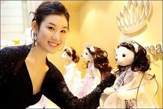 2008 미스코리아 선 최보인이 27일 오후 서울 삼성동 코엑스 태평양홀에서 진행중인 '2008서울인형전시회'를 찾아 자신을 모티브로 만든 테디베어를 보고 환하게 웃고 있다.