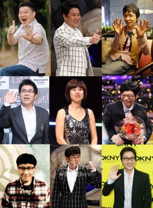 강호동 김구라 김국진 (맨 앞줄) 김용만 박미선 유재석(둘째 줄) 윤종신 이경규 이휘재(마지막 줄)