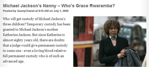 6일 외신에 따르면 오랜 기간 마이클 잭슨 집안의 보모 역할을 했던 그레이스 르와람바가 잭슨 자녀의 양육권 문제와 관련해 뜨거운 감자로 부상하고 있다.