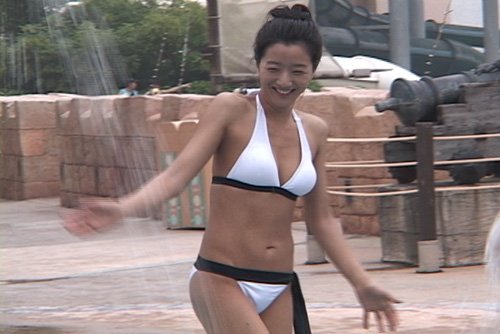 김주현은 눈에 띄는 섹시한 글래머 몸매로 완벽한 S라인을 돋보이게 하는 흰 색 비키니를 입고 촬영장에 모습을 드러냈다.