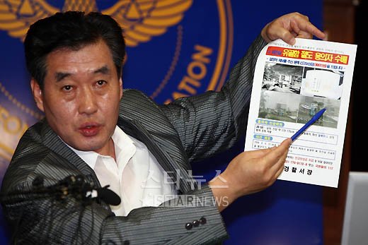 양평경찰서 우재진 수사과장이 24일 오전 경기 양평군 서종면사무소에서 故 최진실 유골도난 사건에 대한 브리핑을 하며 용의자의 모습이 담긴 수배전단을 보여주고 있다. 유골함 도난사건으로 용의자에게 현상금이 걸린 경우는 이번 사건이 처음이다.