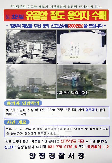 양평경찰서 우재진 수사과장이 24일 오전 경기 양평군 서종면사무소에서 故 최진실 유골도난 사건에 대한 브리핑에서 밝힌 수배전단에 나온 용의자 모습을 공개하고 있다. 유골함 도난사건으로 용의자에게 현상금이 걸린 경우는 이번 사건이 처음이다.