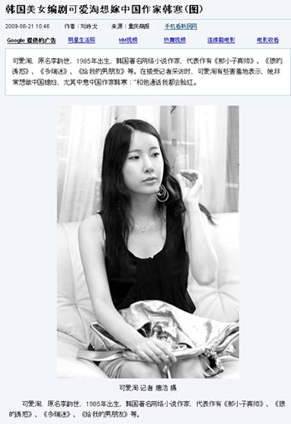 중국 중경상보는 21일 “한국의 미녀작가”라고 귀여니를 소개하며 20일 개최된 팬 사인회에서의 인터뷰 기사를 실었다. “귀여니가 ‘중국남성의 아내가 되고 싶다’고 밝혔으며 특히 중국 작가 한한에 대해 특별한 감정을 언급했다”는 내용이다.