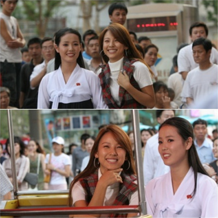 ↑ 2005년 애니콜 CF촬영을 위해 중국 상하이에서 만난 이효리와 조명애의 모습.