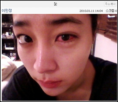 이민정은 11일 자신의 미니홈페이지에 '눈'이라는 제목의 글과 사진을 통해 결막염에 걸린 사실과 이 때문에 드라마 촬영에 지장을 줬다며 사과의 뜻을 밝혔다.