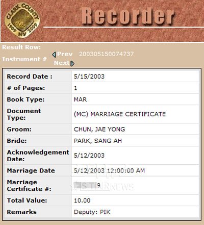 두 사람이 혼인신고를 한 것으로 알려진 미국 네바다주 클라크카운티 공식사이트에 의하면 박상아(PARK, SANG AH)는 전재용(CHUN, JAE YONG)씨와 지난 2003년 5월 12일 결혼한 것으로 기록돼 있다.