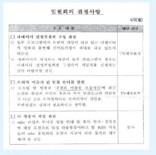 KBS노조 특보에 공개된 임원회의 문건에 따르면 지난 3일 방송된 '특별기획-천안함 침몰사고 국민의 마음을 모읍시다'에 출연에 출연한 명진 스님의 인터뷰와 관련, '사회적 이슈가 된 인물 인터뷰 관련-토요일 밤 방송된 '국민의 마음을 모읍시다'에 최근 논란에 중심에 서 있는 봉은사 주지 명진 스님의 인터뷰가 나간 것은 부적절하다는 심의 지적이 있었음. 객관성 있는 섭외가 필요하다고 생각됨'이라고 적혀있다.