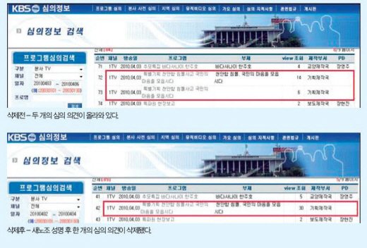 KBS노조는 "KBS노조가 성명에서 명진 스님 관련 '임원회의 결정사항'을 지적한 직후 명진 스님 인터뷰를 문제 삼았던 심의 의견이 심의정보 게시판에서 삭제됐다"고 의문을 제기하며 "이 심의 의견은 누가 어떤 의도로 작성한 것이며, 사측은 왜 이 게시글을 삭제했는가?"라고 지적했다.