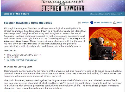 영국 선데이타임스는 25일(현지시간) 호킹 박사가 “외계인은 거의 확실히 존재한다”며 “E.T. 보다는 V의 난폭한 녹색 괴물에 가까운 외계 생명체가 있을 것”이라고 다큐멘터리 전문 방송사 디스커버리채널을 통해 밝혔다고 보도했다. 우주기원론 천재 학자의 발언이기 때문에 파장이 더 크다.