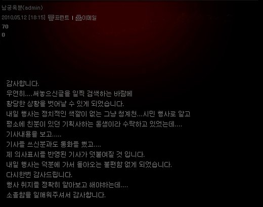 남궁옥분은 지난 12일 '조전혁이나 한날당과 막역한 관계에 있습니까?'란 팬의 글에 "덕분에 황당한 상황을 벗어날 수 있게 돼 감사하다"며 행사의 취지를 몰랐다는 답글을 달았다.