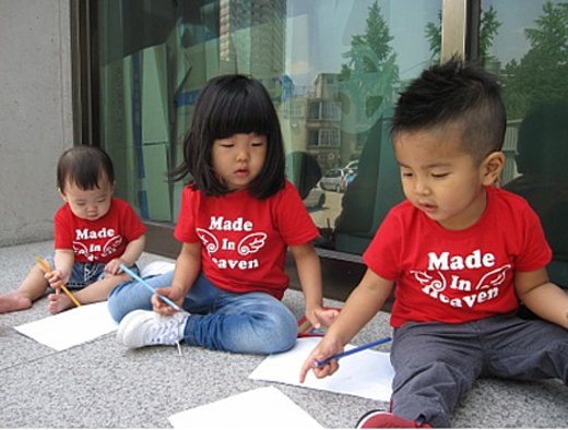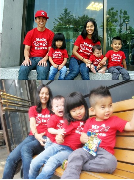 션이 공개한 사진 속에는 딸 하음(4), 아들 하랑(3), 하율(1)과 아내인 배우 정혜영(37)이 환한 웃음을 짓고 있다. 'Made in Heaven(천국에서 제작된)'이라 적힌 붉은 티셔츠를 입어 대한민국 축구 응원단을 상징하는 붉은 악마를 연상케 한다.