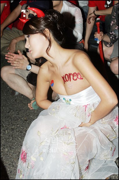 '똥습녀' 임지영이 축구국가대표팀의 남아공 월드컵 16강 진출이 결정된 23일 새벽 서울 영동대로 거리응원서 속이 훤히 비치는 한복을 입고 나와 세인들의 시선을 끌고 있다.