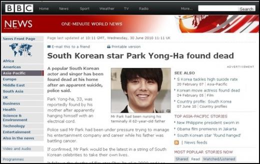 BBC인터넷판은 "톱 배우이자 가수인 박용하가 자신의 집에서 숨진 채 발견됐다. 경찰에 따르면 목을 매 숨진 것으로 생전 매니지먼트 운영과 암 투병 중인 부친에 대한 염려도 상당한 스트레스를 받아왔다"고 보도했다.