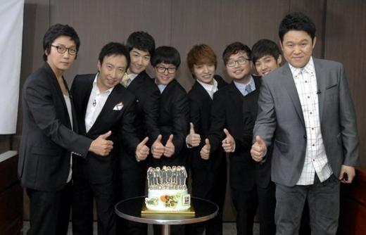 ↑(왼쪽부터) '일밤' '뜨거운 형제들'의 탁재훈, 박명수, 한상진, 노유민, 싸이먼디, 박휘순, 이기광, 김구라