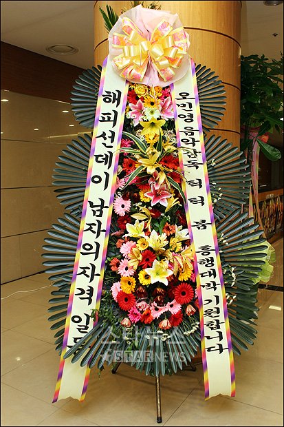 5일 오후 서울 중구 충무아트홀에서 열린 뮤지컬 '틱,틱...붐!' 프레스리허설에 KBS2TV '해피선데이-남자의 자격'에서 뮤지컬 선전을 기원하는 축하화환을 보내 눈길을 끌고 있다.