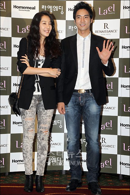 탤런트 윤지민과 강지섭이 이유진의 결혼식을 축하하기 위해 참석하고 있다.