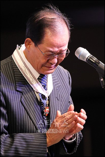 원로 희극인 임희춘이 22일 오후 서울 장충동 신라호텔에서 열린 정부포상인 '제1회 대한민국 대중문화예술상' 시상식에 참석해 보관문화훈장을 수여받은 뒤 수상소감을 밝히며 눈물을 흘리고 있다.