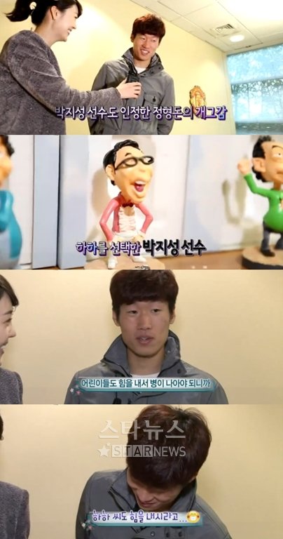 지난달 30일 박지성은 기부 문화 확산을 위해 방송에 출연했다. 평소 '무한도전'을 즐겨본다는 박지성은 "가장 마음에 드는 캐릭터를 골라 달라"는 질문에 하하를 꼽았다.