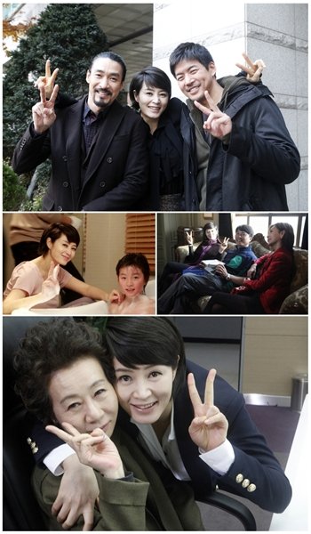 7일 공개된 현장 사진에서는 극중 캐릭터와 180도 다른 김혜수의 모습이 눈길을 끈다. 김혜수는 동료 배우들에 둘러싸여 환한 미소와 함께 손으로 귀여운 브이자를 그리고 있다.