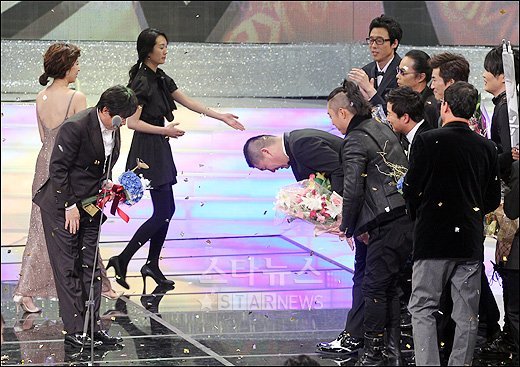 지난해 강호동은 2연속 대상을 수상하며 씨름판 천하장사에서 방송인 천하장사로 발판을 마련해준 이경규에게 존경을 표했다. 하지만 그는 이번 시상식에서 대상의 영예를 안으며 더 이상 대상을 차지한 후배들의 수상소감에만 등장하는 선배로 그치지 않았다. 더불어 강호동은 연예대상의 왕좌를 '존경하는 선배' 이경규에게 내어주며 90도 허리 인사로 경외감을 드러냈다.